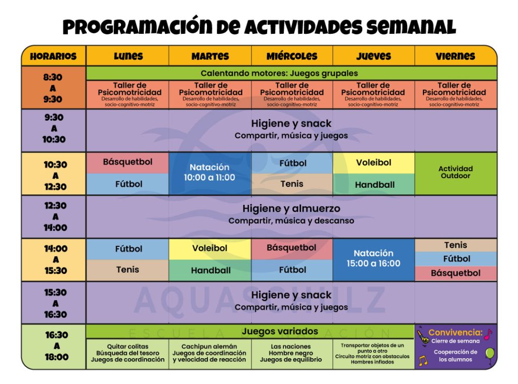 Adicional a esto los días de natación los niños deben traer: traje de baño, gorro, lentes, toalla y chalas